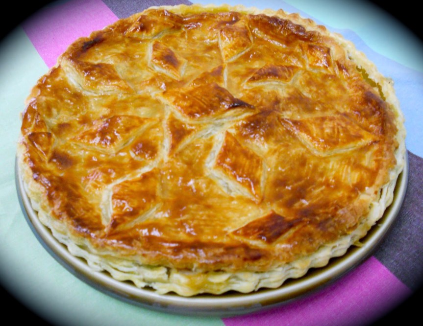 Cette garniture refroidie est mise sur la pâte feuilletée et recouverte comme une tourte et dorée à l’œuf. Cuisson au four.