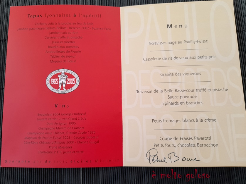 Menu des 40 Ans de 3 étoiles – restaurant Paul Bocuse (Collonges-au-Mont-d’Or 69). Menu de célébration des 40 Ans de 3 étoiles Michelin de Paul Bocuse à Collonges-au-Mont-d’Or. Partager : Cliquer pour partager sur X(ouvre dans une nouvelle fenêtre) X Cliquez pour partager sur Facebook(ouvre dans une nouvelle fenêtre) Facebook J’aime chargement… Similaire