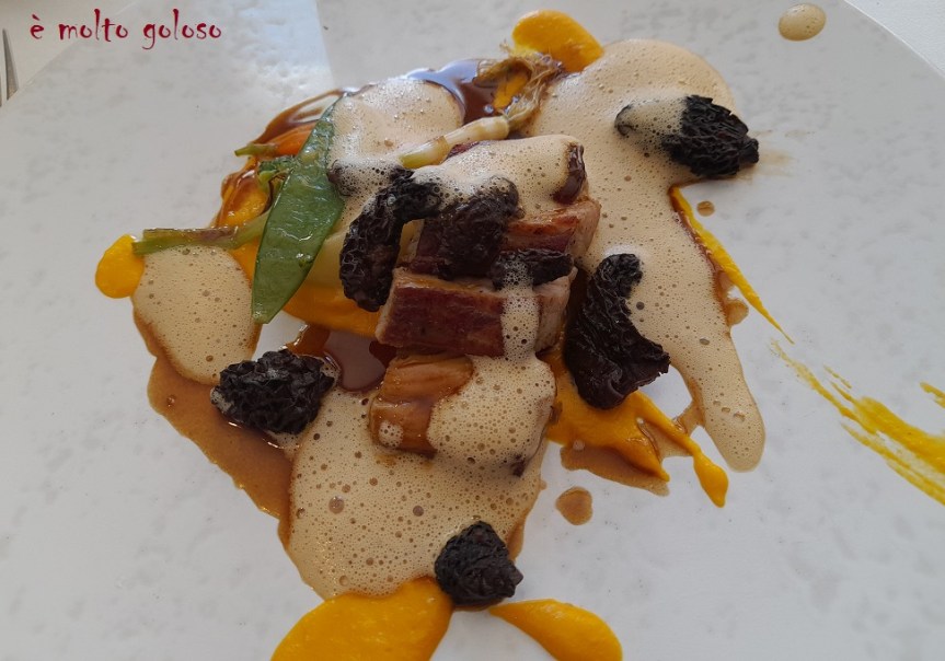 Noix de veau de Corrèze rôtie, ragoût de petits légumes primeurs aux morilles, écume réglisse