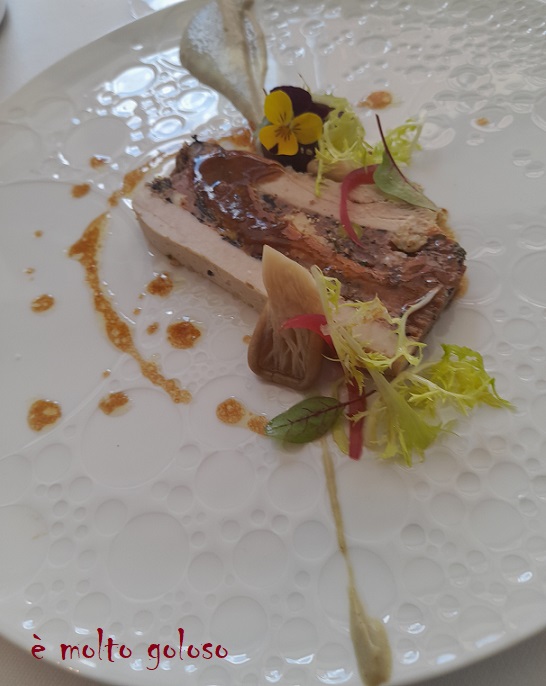 Pressé de pintade fermière et foie gras aux fruits secs, pulpe d’artichaut et jeunes pousses, vinaigrette viande
