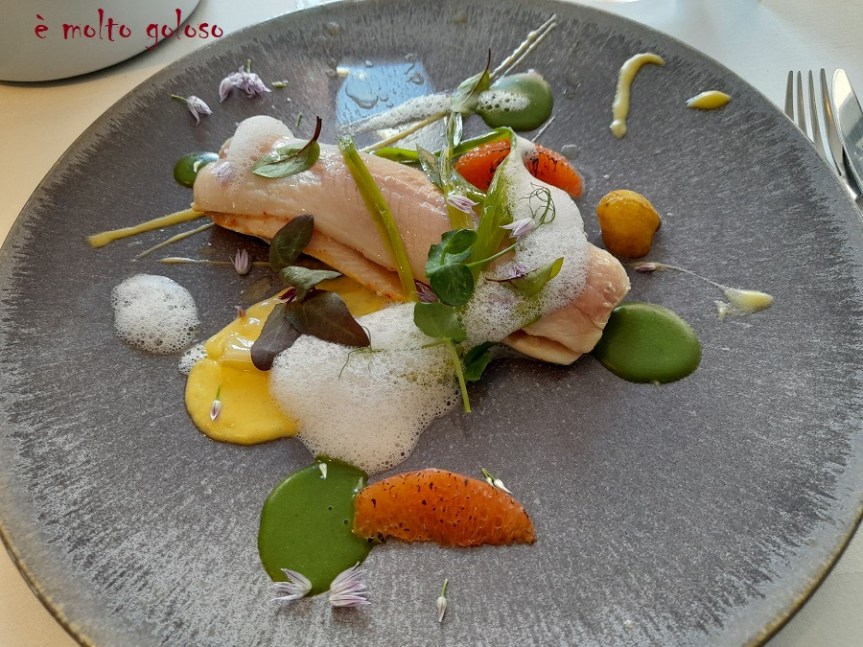 Truite fario de la Famille Murgat, sabayon acidulé au beurre noisette, pommes de terre nouvelles, jeune poireau et pamplemousse