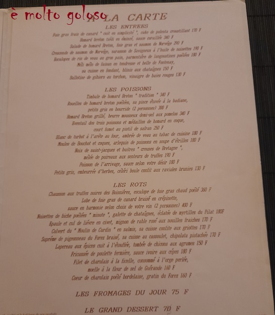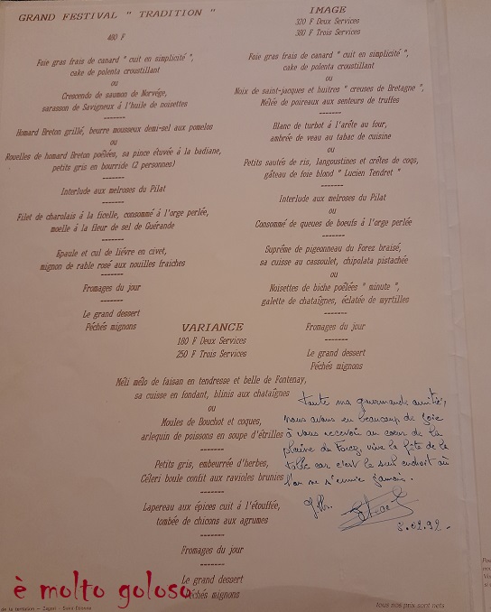 Carte restaurant La Poularde 8 février 1992, chef Gilles Étéocle MOF Cuisine 1982 – Montrond-les-Bains (Loire).