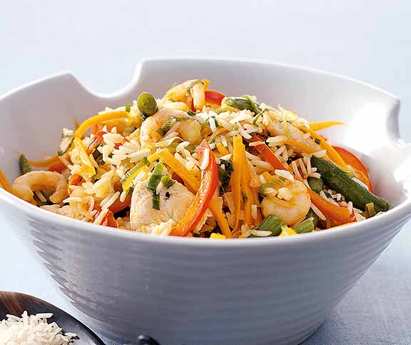 Le Nasi Goreng est une spécialité indonésienne, faite de riz sauté avec du poulet émincé ou du bœuf ou du porc, de l’oignon puis garnie de chair de homard en dés.