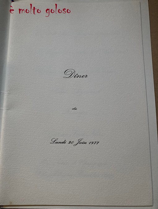 Menu Palais de l’Elysée – Déjeuner du 20 juin 1977. Partager : Cliquer pour partager sur X(ouvre dans une nouvelle fenêtre) X Cliquez pour partager sur Facebook(ouvre dans une nouvelle fenêtre) Facebook J’aime chargement… Similaire