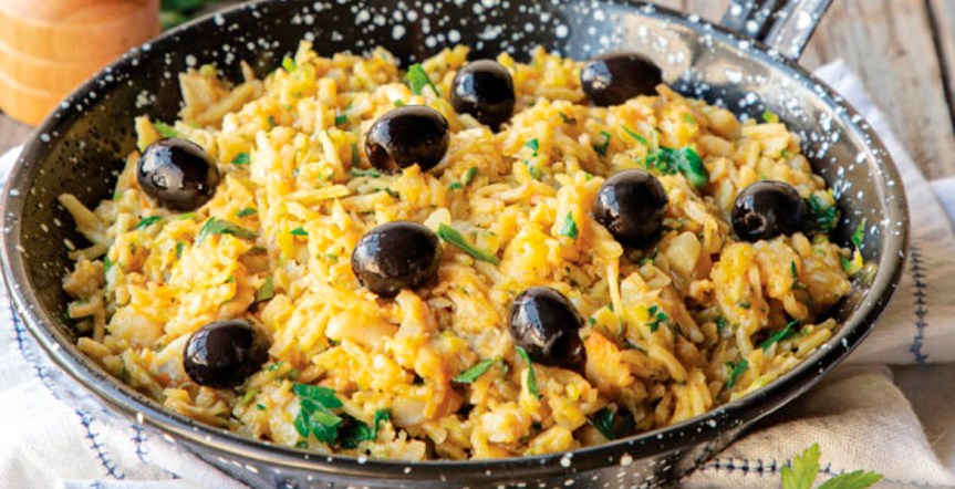 Le morue à bràs est un ragoût de morue (morue émiettée et désarêtée), pommes de terre frites et oignons, le tout est lié avec une omelette aux herbes. C’est un plat traditionnel de la cuisine Portugaise (Lisbonne). La décoration se fait avec des olives noires.
