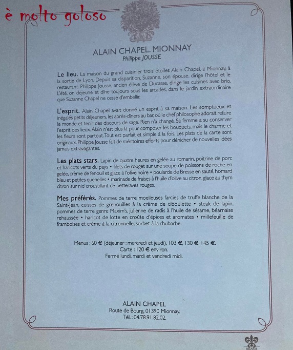 Carte restaurant Alain Chapel à Mionnay (01). Carte restaurant Alain Chapel à Mionnay – Chef Philippe JOUSSE. Partager : Partager sur X(ouvre dans une nouvelle fenêtre) X Partager sur Facebook(ouvre dans une nouvelle fenêtre) Facebook J’aime chargement… Similaire