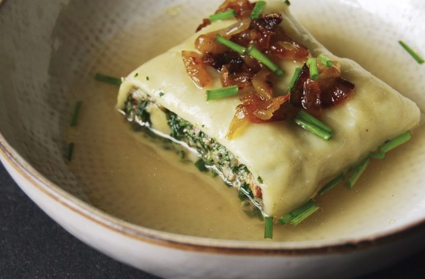 Les Maultaschen sont de gros raviolis allemands originaire de la Souabe. Ils sont farcis à la viande et aux épinards, relevés de marjolaine, de muscade et d’oignon, et pochés dans un bouillon de viande.