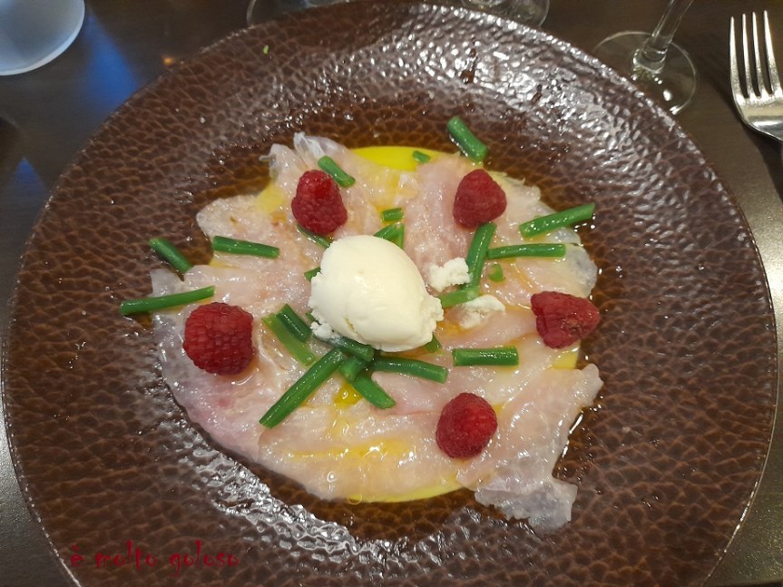 Carpaccio de daurade, framboises, haricots verts et glace balsamique blanc