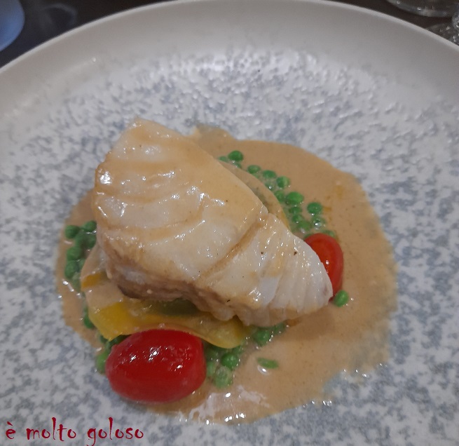 Dos de cabillaud, raviole épinard ricotta, petits pois et crème tourteau