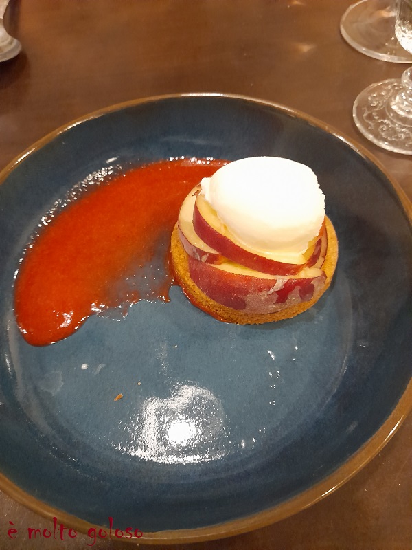 Sablé breton spéculos, pêches, glace citron miel, pêche de vigne