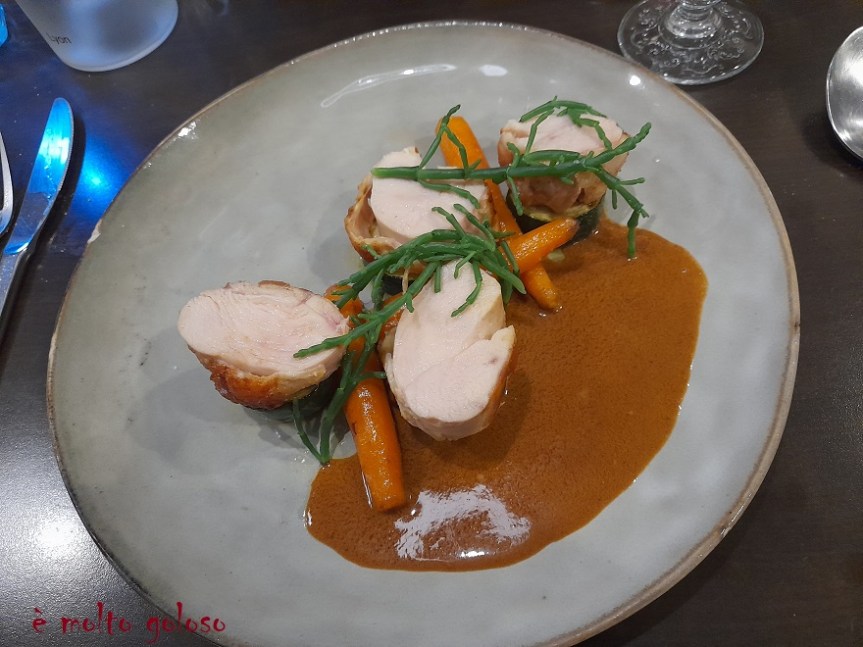 Suprême de poulet jaune, salicornes, pâte curry, courgettes et carottes