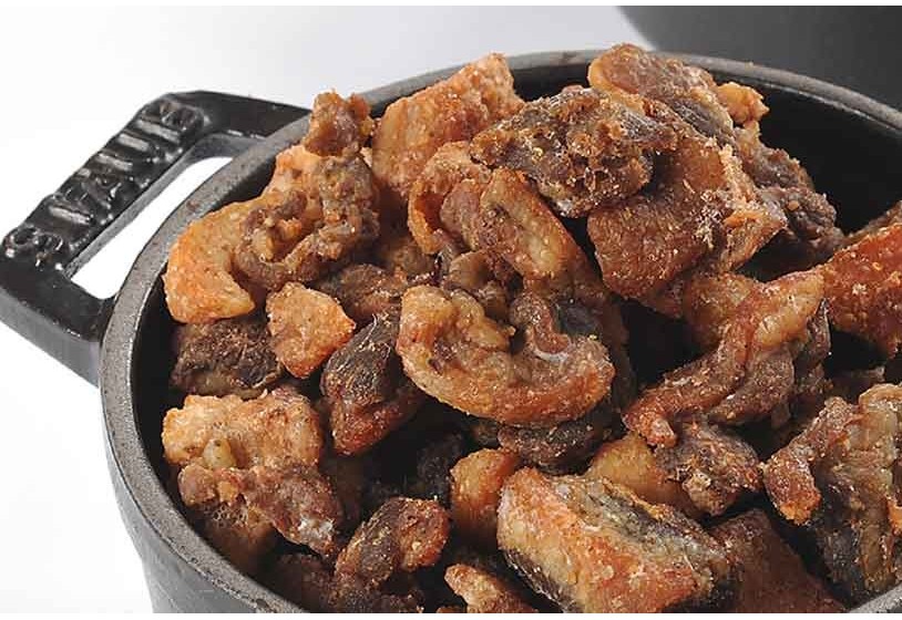 Les grattons Auvergnats contiennent gorge et gras de porc détaillés en lanières et cuits dans la graisse, hachés, moulés et pressés.