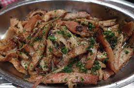 Le gras double est composé de morceaux de panse de bœuf (partie la plus grasse de l’estomac), échaudés et cuits à l’eau.