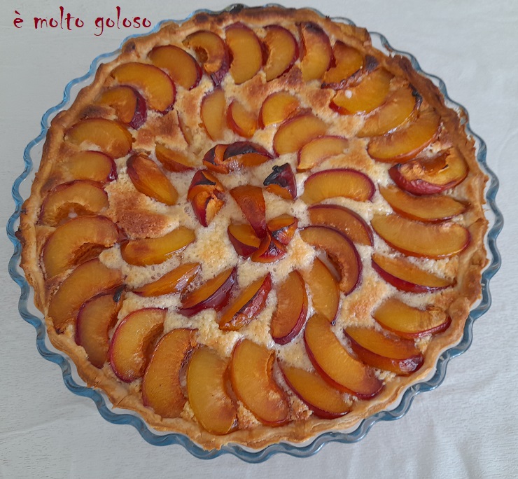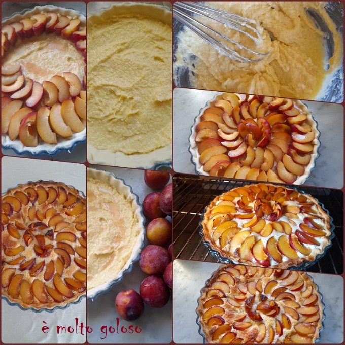 - Laver, couper en 6 les prunes (variété grenadine). Les ranger sur la crème en rosace. Lustrer légèrement d’une gelée de prunes (partie liquide de la confiture).