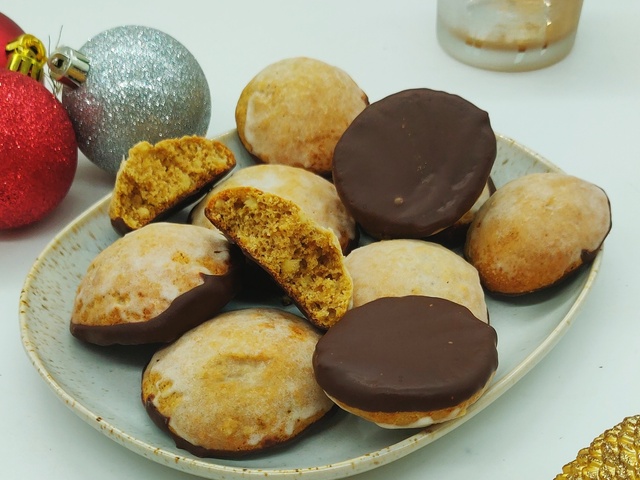 Les Lebkuchen sont de petits gâteaux de pain d’épices à la pâte d’amandes et aux agrumes confits, ils sont ronds et glacés au chocolat sur le dessous.