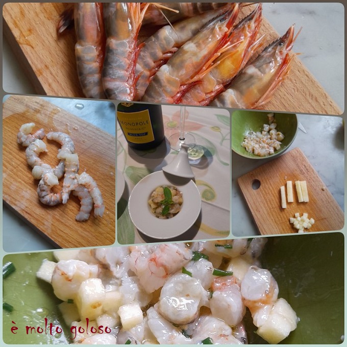 - Ajouter les dés de pomme verte aux gambas. Finir avec de la ciboulette ciselée. Mélanger délicatement.