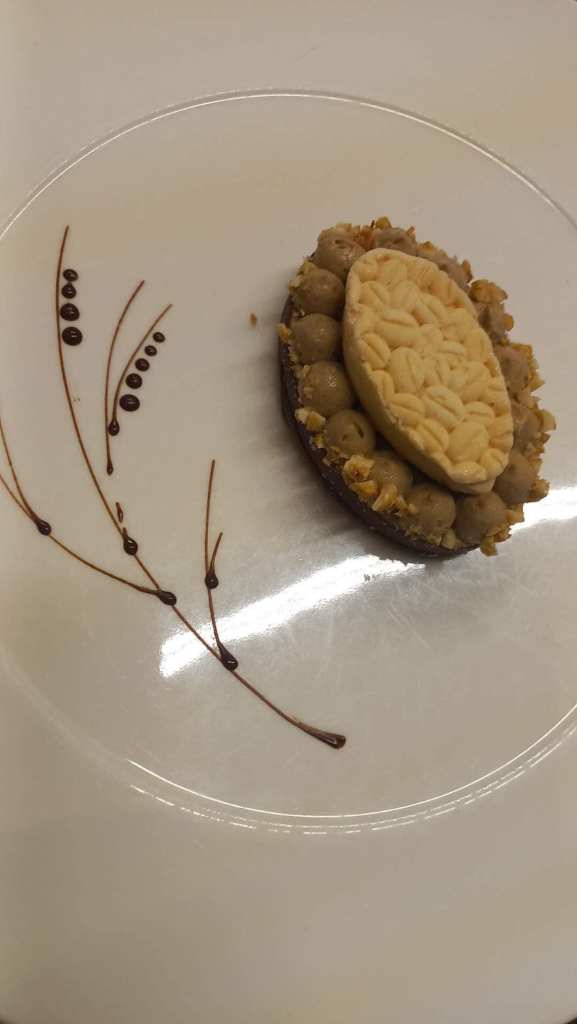 de génoise, d’une crème au café de réalisaton libre et d’un décor en chocolat au cornet. Tous les