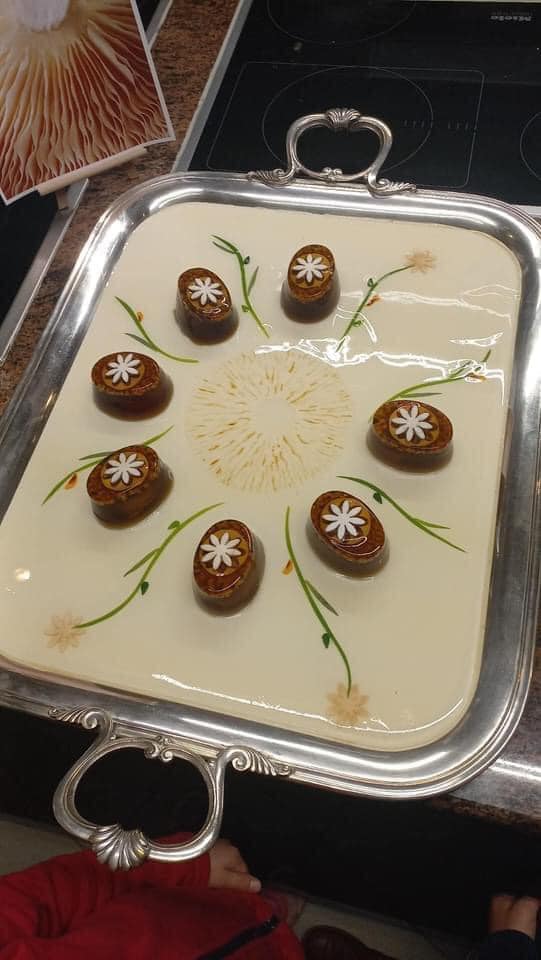 chaud-froid décoré : les œufs mollets seront cuits, gélifiés et décorés sur place. Le plat de dressage