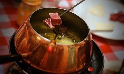 La Fondue bourguignonne est un plat convivial composé de cubes de bœuf qui sont piqués sur une longue fourchette à deux dents et que l’on plonge dans un caquelon (poêlon) rempli d’huile très chaude. Les morceaux de bœuf sont dégustés avec un assortiment de sauces (bourguignonne, béarnaise, ketchup, tartare, rouille, mayonnaise). D’autres viandes (rouges de préférence) peuvent être utilisées.