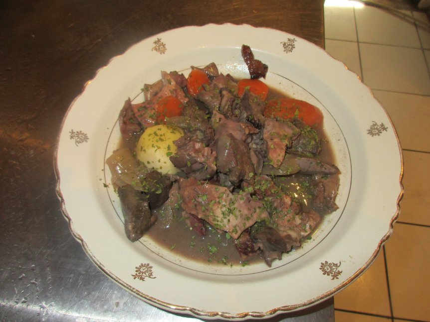 Le cœur, les poumons et le foie étaient découpés en morceaux et rissolés au saindoux avec des échalotes et de l’ail, farinés et mouillés avec du vin rouge et bouillon. Un bouquet garni était ajoutait avec des oignons et des pommes de terre émincées et sautées.