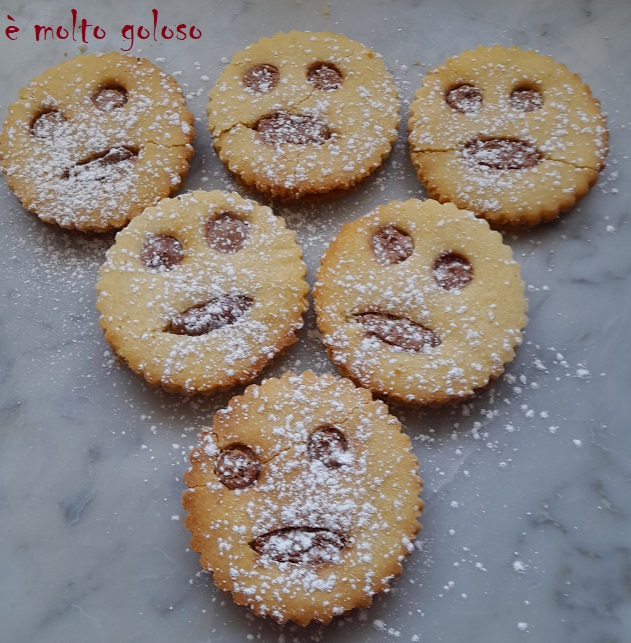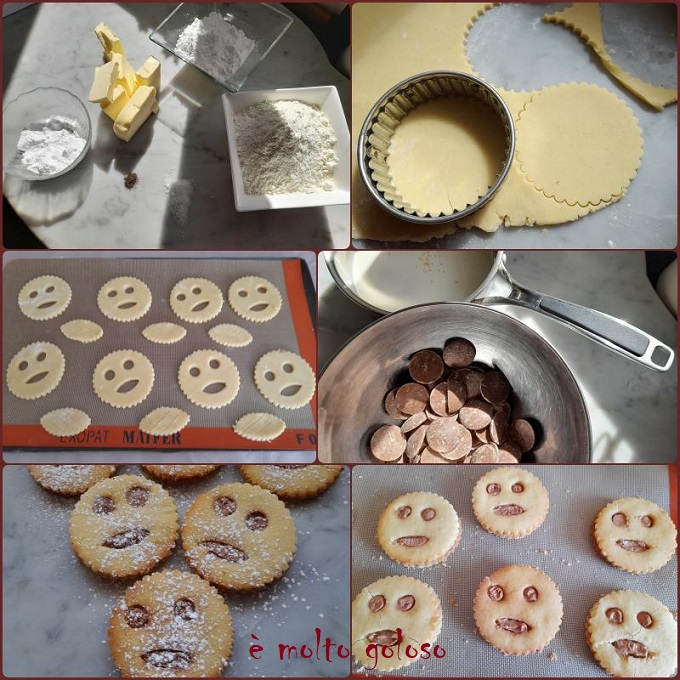 - Abaisser la pâte sablée à 4 mm d’épaisseur. Détailler 16 disques de 8 cm de diamètre. Réaliser les yeux et bouches sur 8 disque (genre smiley).