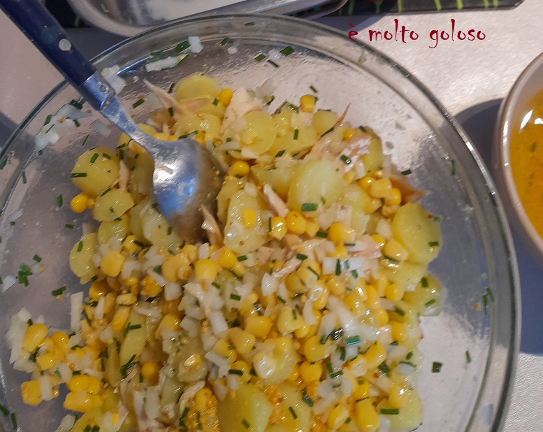 - Couper les pommes de terre grenailles en tranches. Ajouter l’oignon, la vinaigrette et de la ciboulette ciselée.