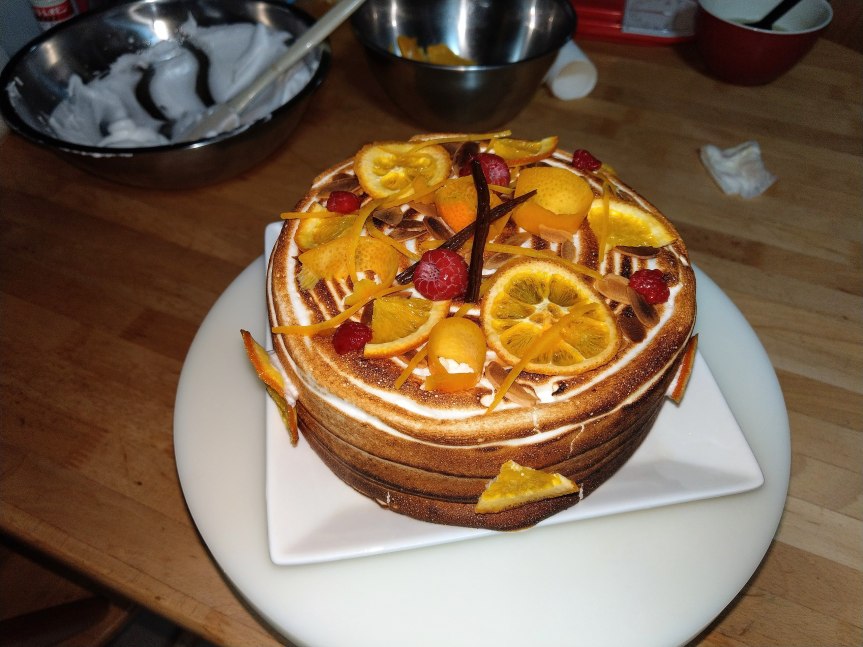 Elle est fourrée et masquée de crème au beurre pralinée. Son tour est parsemé d’amandes effilées. Le dessus est décoré en damier.