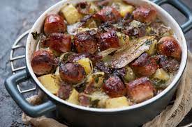Le Dublin coddle (marmite de Dublin) est un ragoût de saucisse avec des pommes de terre, des oignons et de la ventrèche (bacon).