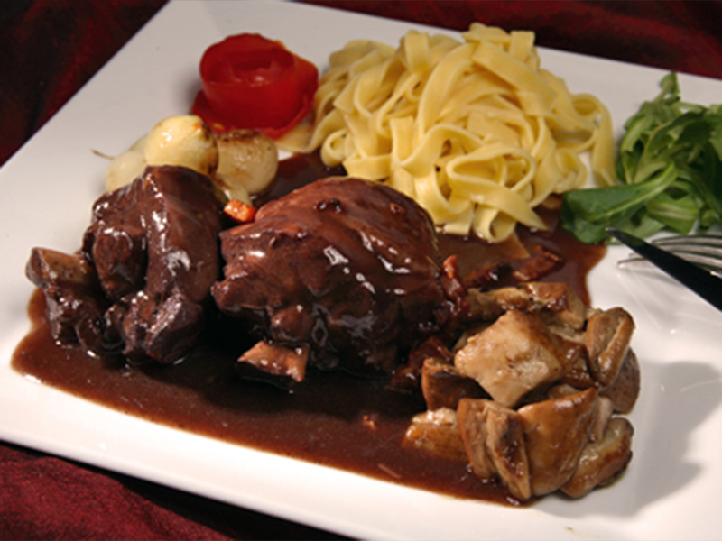 Recette de coq au vin classique en utilisant un vin rouge de Bouzy – côteaux champenois, vin peu abondant, mais réputé pour son parfum de violette (village de Champagne connu également pour ses champagnes).