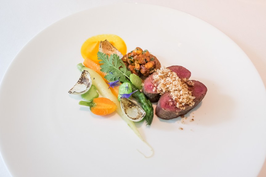 - Langoustine bretonne marinée, soja millésimé, potiron, rayon grillée, beurre au thym, laque, tomate, fines herbes – Cabillaud, couteaux, chou pointu, lavande de mer – Caviar Paris’Osciètre Prestige, topinambour, céleri, noyer – Ris de veau morilles, fèves – Pigeon d’Anjou, pruneau fermenté, foie de canard, aubergines – Fraises, rhubarbe, fleurs, mélisse, cire d’abeilles.