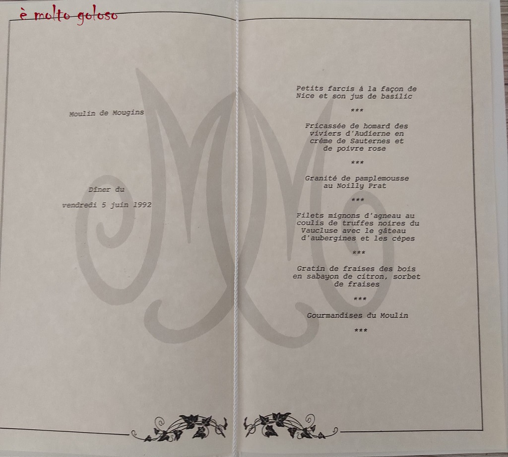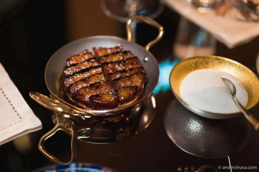 Turbot grillé et couteaux, beurre de chèvre, barigoule d’artichaut et thym – Tartare de cerf élaphe, nappé de caviar relevé de finger lime – Coquille Saint-Jacques d’Hokkaïdo, vinaigrette au babeurre, concombre, uni et coriandre – Bœuf de Miyazawa, bouquet de ciboulette – Pain perdu signature Grande Tradition, crème de parmesan, truffes d’automne et consommé de queue de bœuf clair – Dessert au thé, lait, miel, graines de citrouille et yuba sur une gaufre à la banane et jasmin – Tarte aux ananas grillés