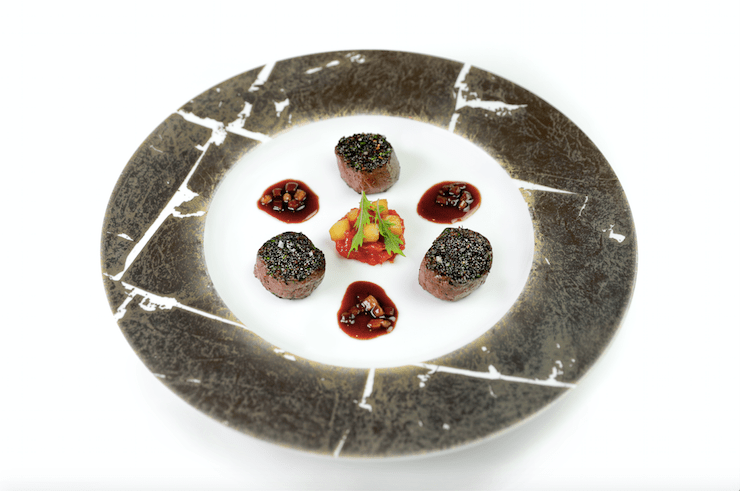 Langoustine de Loctudy, sauce à l’huile d’olive – Oursins sur un soufflé moelleux, sauce crustacés – Œuf en mimosa « Île-de-France », caviar et coulis iodé – Soupe chaude à la gelée de poule, crème madérisée et girolles – Mini brochettes de poissons fumés, sauce aromates – Bar de petite pêche « ike Jime » voilé de champignons, sauce marinière – Filet d’amadai avec concassée de tomates, courgettes et jus de citron – Fricassée de ris de veau aux câpres et céleri-rave -Canard de Challans rôti sur sa poitrine, cerise du Mont Ventoux – Filet de bœuf aux aromates, jus court et pommes soufflées – La fraise Mara des Bois en demi-sphère au fromage blanc -Jubilée de cerises tièdes crème brûlée, éclats d’amandes – Pêche blanche dans une boule en sucre soufflé.