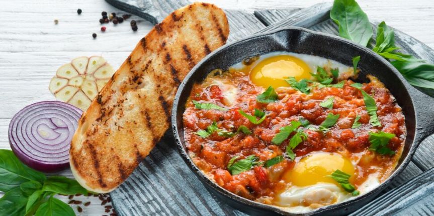 Le Chakchouka est un plat traditionnel de la cuisine arabe et maghrébine, c’est un ragoût de pommes de terre et oignons cuit dans à l’huile, assaisonné de piment, d’harissa et de sauce tomate sur lequel on casse des œufs qui une fois cuits sont saupoudrés de menthe sèche.