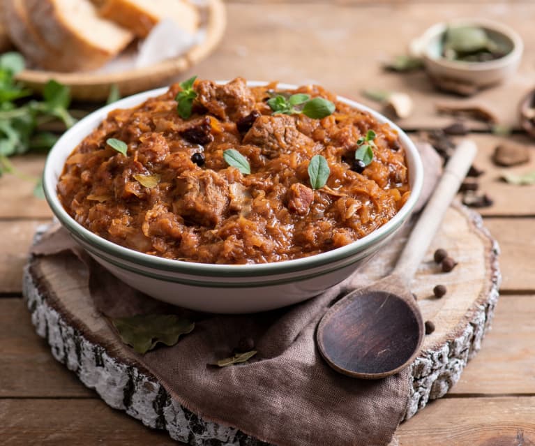 Le Bigos est un plat polonais également appelé ragoût du chasseur, il est fait de couches alternées de choucroute et de viandes cuites longuement, mijotées avec un bouillon.