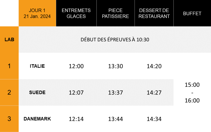 Les 7 équipes participantes auront 5h30 pour présenter les 16 desserts de dégustation et les 2 pièces artistiques, ainsi qu’un buffet avec l’ensemble de leurs œuvres.