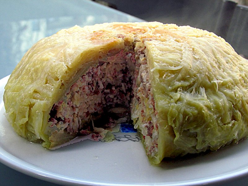 C’est un chou farci de chair de lapin ou de lièvre garnie de fines herbes, mis en terrine, mouillé au bouillon et cuit lentement au four.