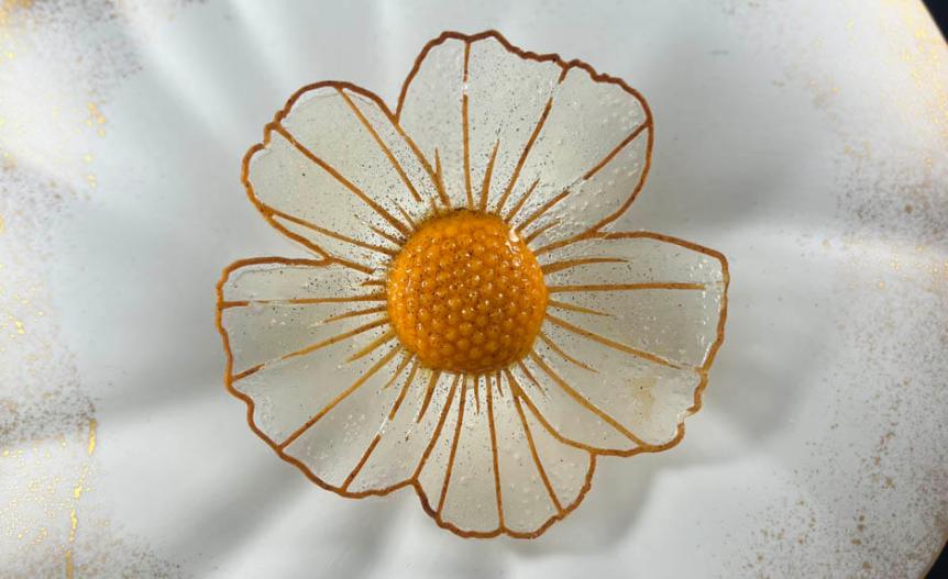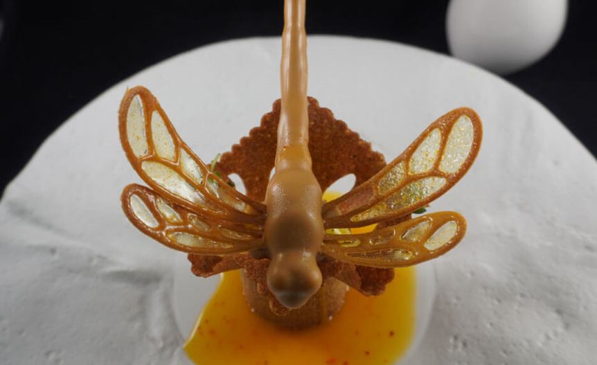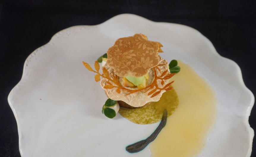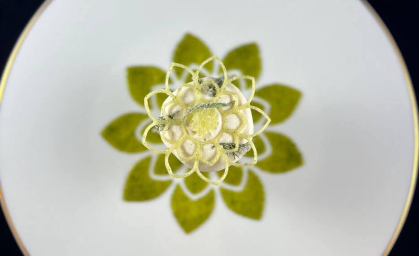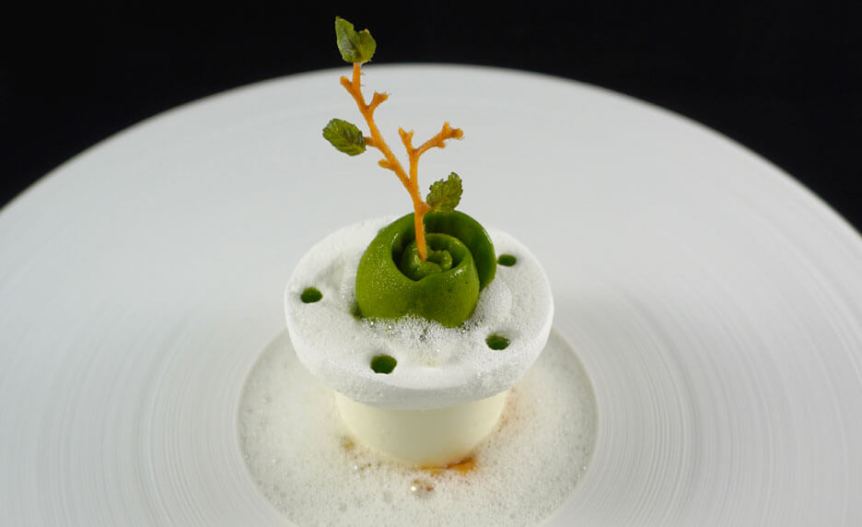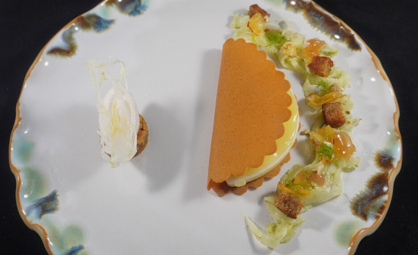 Fleur d’agrumes : Biscuit huile d’olive, marmelade d’agrumes, tartare de mandarine, tuile et coulis d’herbes, parfait glacé au poivre de Timut, crumble croustillant et siphon de citron vert.