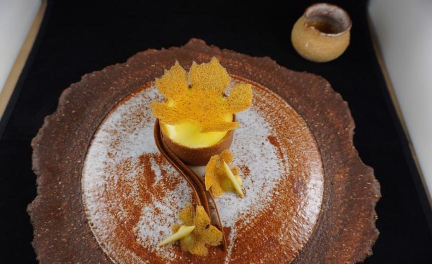 Un détour en Bourgogne : dessert alliant la cazette, le lentin de chêne et le vin jaune. Le tout souligné par des nuances herbacées au cresson de fontaine.