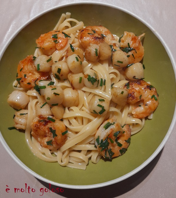 - Sauter vivement et rapidement les crevettes, ajouter 200 grammes de pétoncles. Assaisonner et ajouter de la ciboulette ciselée.