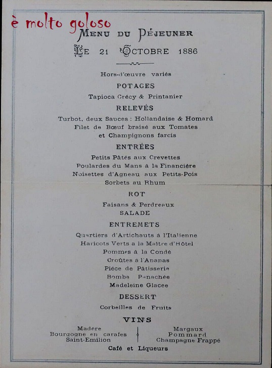 Menu de mariage – Grand Véfour 21 octobre 1886. Partager : Cliquer pour partager sur X(ouvre dans une nouvelle fenêtre) X Cliquez pour partager sur Facebook(ouvre dans une nouvelle fenêtre) Facebook J’aime chargement… Similaire