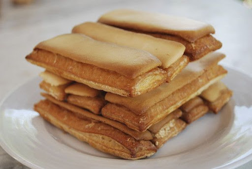 Pour un dessert, la pâte est sucrée, il s’agit d’allumette glacée, petit gâteau individuel (création d’un pâtissier de Dinard nommé Planta).