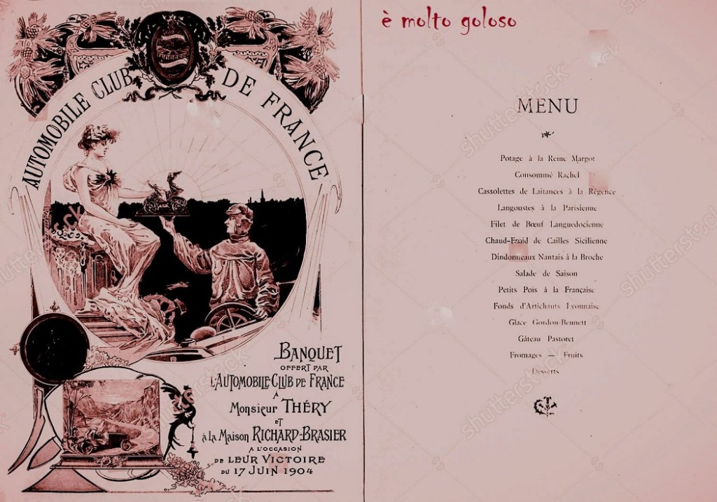 Menu du Banquet de l’Automobile Club de France – 17 juin 1904 – La Tour d’Argent à Paris. Partager : Cliquer pour partager sur X(ouvre dans une nouvelle fenêtre) X Cliquez pour partager sur Facebook(ouvre dans une nouvelle fenêtre) Facebook J’aime chargement… Similaire