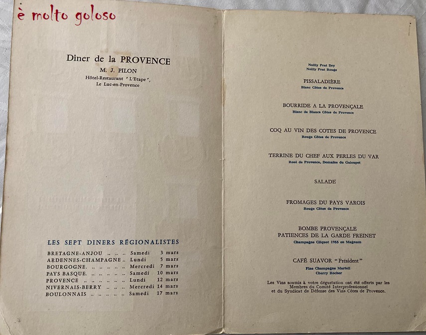 Dîners Régionalistes – Provence – le lundi 12 mars 1962. Dîner Provence – chef J. PILON – Hôtel Restaurant L’Étape à Le Luc-en-Provence. Partager : Cliquer pour partager sur X(ouvre dans une nouvelle fenêtre) X Cliquez pour partager sur Facebook(ouvre dans une nouvelle fenêtre) Facebook J’aime chargement… Similaire