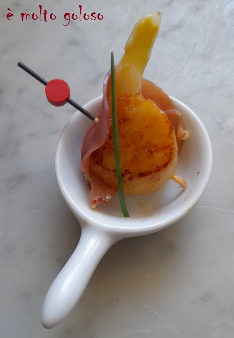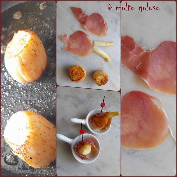 - Rouler les noix dans le jambon cru avec 1 pointe d’asperge. Tenir avec une petite broche en bois.