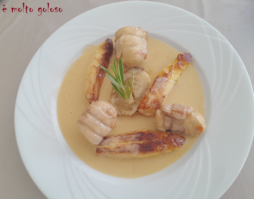 - Éplucher 6 belles asperges blanches. Les cuire à l’anglaise croquantes.