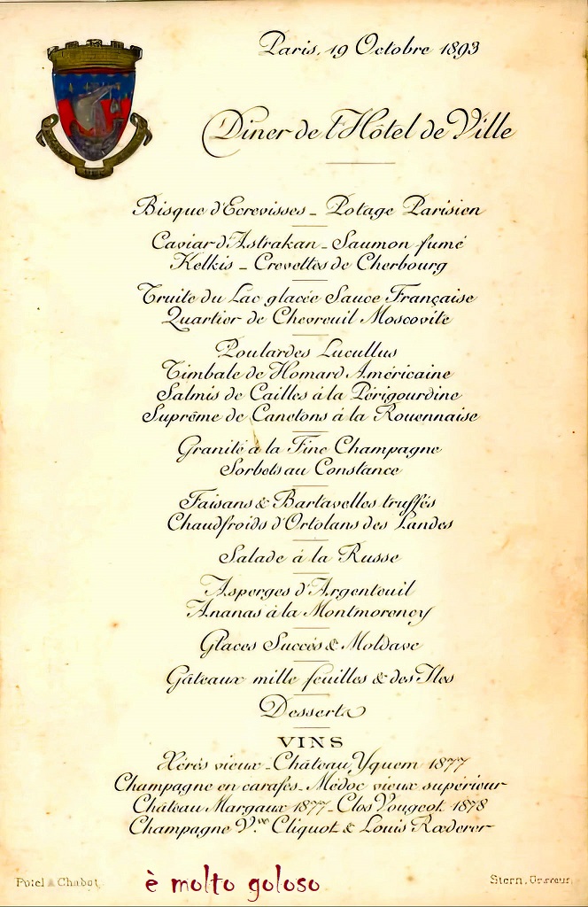 Menu du Diner du 19 octobre 1893 en l’honneur des Officiers de l’Escadre Russe – Hôtel de Ville de Paris. Menu réalisé par Potel et Chabot.
