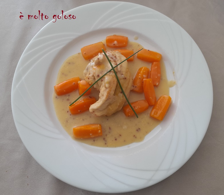 - Dresser sur assiettes chaudes : volaille nappée de sauce et carottes tournées. Finir avec 2 brins de ciboulette.