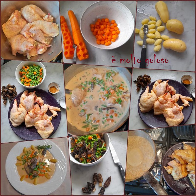 Fricassée de volaille fermière à la crème, petits légumes et morilles.