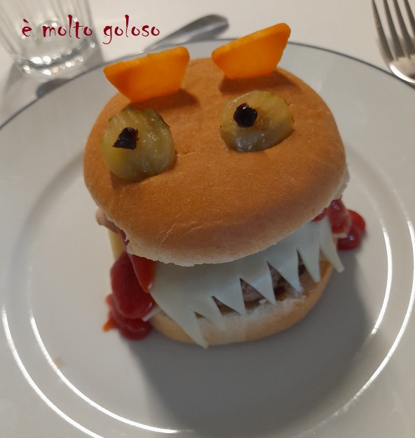 - Montage : petit pain, ketchup, bacon, fromage, steak, bacon, fromage en forme de dents, ketchup coulant pour le sang. Finir avec le 2ème pain décoré.