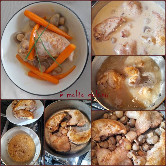 - Suer l’oignon ciselé dans le beurre, singer (farine 60 grammes). Mouiller avec 1 litre de fond blanc de volaille et la cuisson des champignons. Amener à ébullition et finr de cuire la volaille dans le velouté. Retirer les ailes en premier.